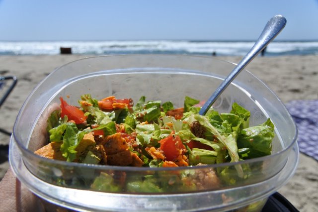 I never know what kind of food to bring on a beach day. I always have big plans to make something more than my typical sandwich, but I never get around to figuring it out. I was determined to bring lighter fare to the beach last weekend (because, you know, beach attire + big lunch= exhausted from sucking in my gut all day). I decided to bring my family’s favorite salad, Taco Salad. It’s easy, satisfying, light, portable, easy to eat, and most importantly it’s delicious. The protein from the turkey meat and cheese sustained our energy, the tortilla chips satisfied my carb craving and it didn’t feel heavy after eating. Perfect for a lunch at the beach.